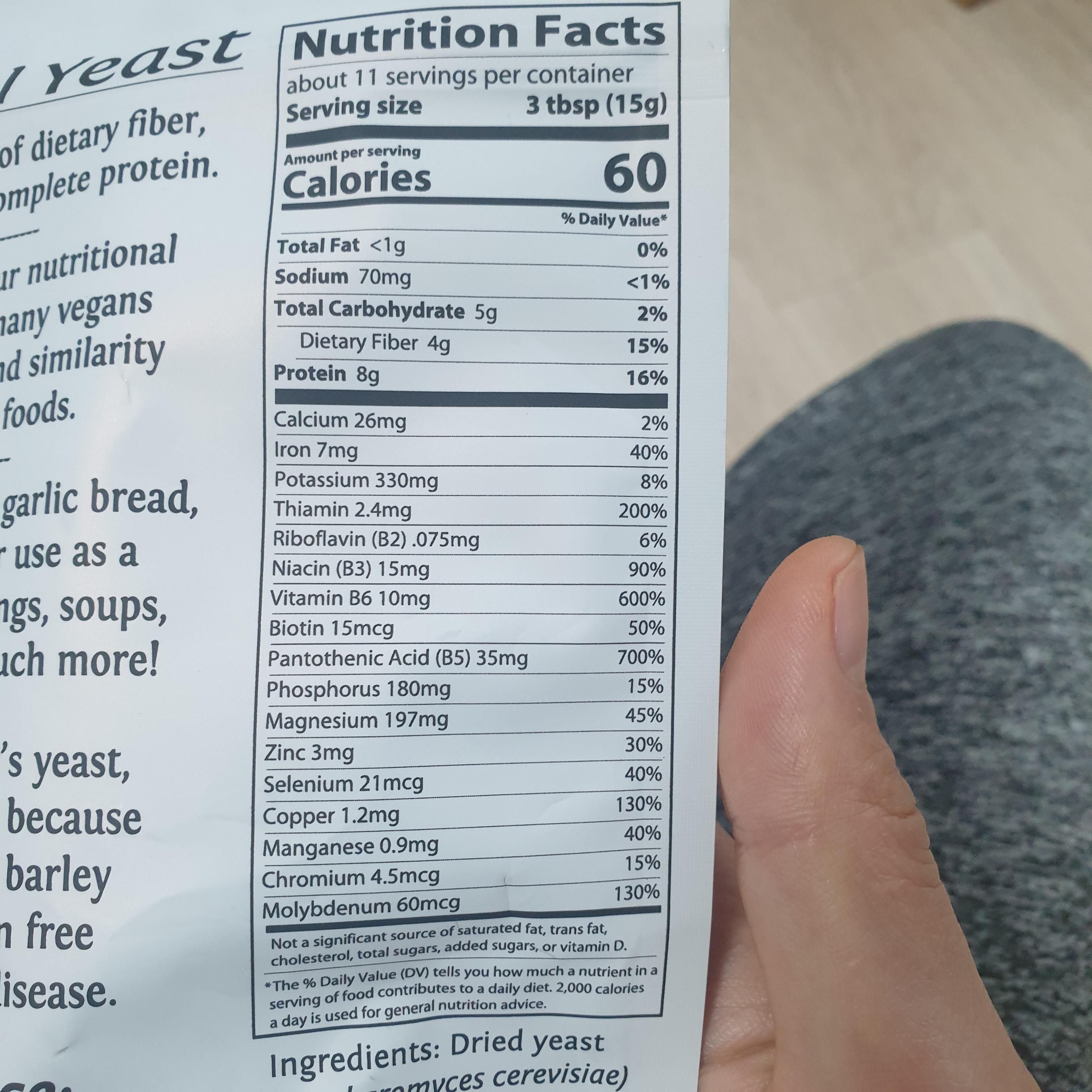 Nutritional yeast is a source of dietary fiber,
